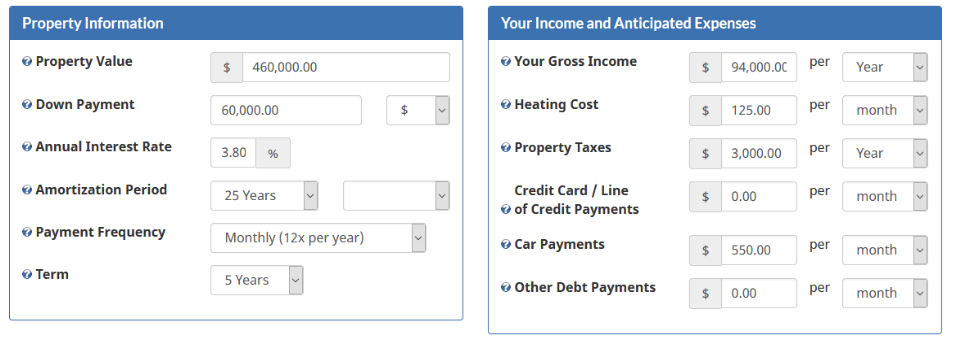 Serena, a graduate of the University of Waterloo, would like to buy a bungalow located near Niagara Falls for $460,000. With some help from her family she has saved $60,000 for the down payment. As a professional accountant, her annual employment income is $78,000. She needs to pay $550/month for her car loan. Her monthly heating bill is $125 and the annual property tax she will need to pay is $3,000. She wants to get a mortgage with a 25-year amortization period. The interest rate on the mortgage would be 3.8%.